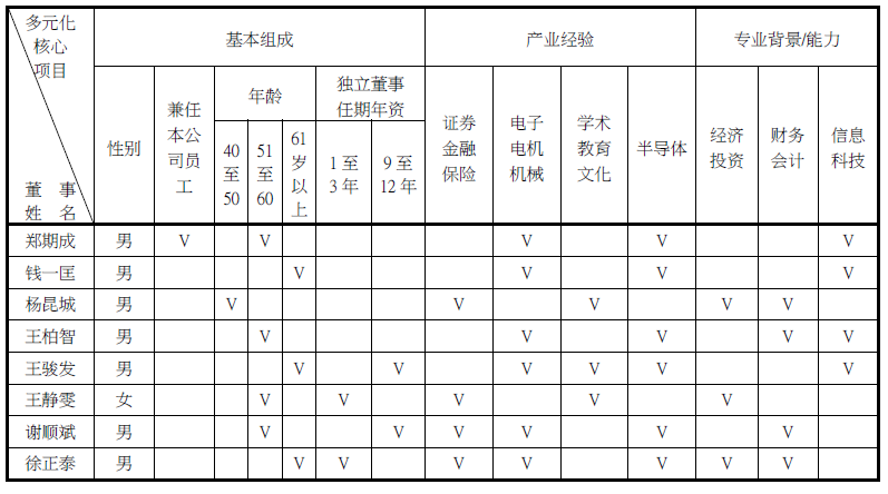 注:本公司董事会成员之遴选以董事专业背景与技能、独立性及公司发展所需之规划为主要考虑,惟因科技产业特性,董事成员以男性为主,现任8席董事中包含7 席男性及1席女性,短期内未能符合任一性别董事席次达三分之一之结构。本公司拟于后续董事改选,目标至少有1 席以上为女性董事,于未来仍持续依公司营运发展规划致力提升女性董事占比以落实多元化政策。