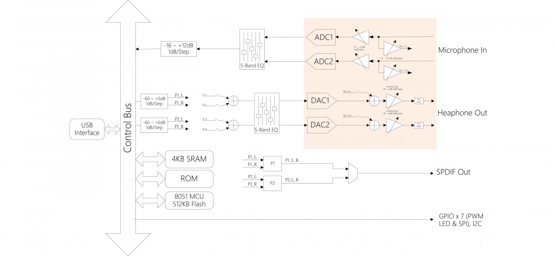 - 2-channel DAC outputs with headphone amplifier (supports 16/24/32-bit resolution and 192KHz, 176.4KHZ, 96KHZ, 88.2KHZ, 48KHz, 44.1KHz sampling rates