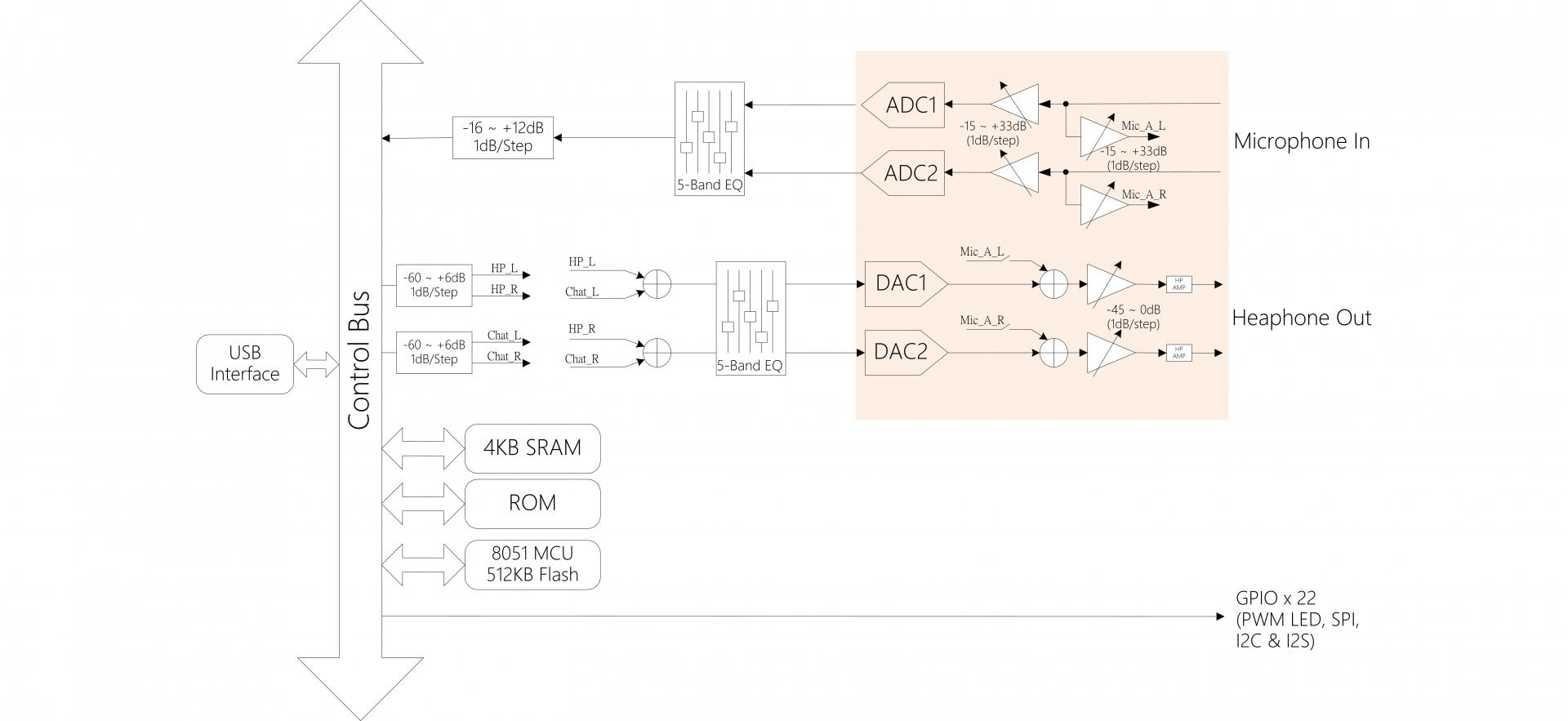 The CM6646X1 is a USB 2.0 high-speed audio codec with 2-channel DAC and 2-channel ADC for Gaming Headset applications. It supports two playback audio devices with independent volume control for game and chat. It also supports mixing function for two playback audio devices. Moreover, the CM6646X1 supports I2C, SPI, UART and GPIOs to communicate with external device. There are 5 bands EQ for both playback and recording interface to compensate the frequency response of speaker or MIC unit or to fulfill personal listening experience.