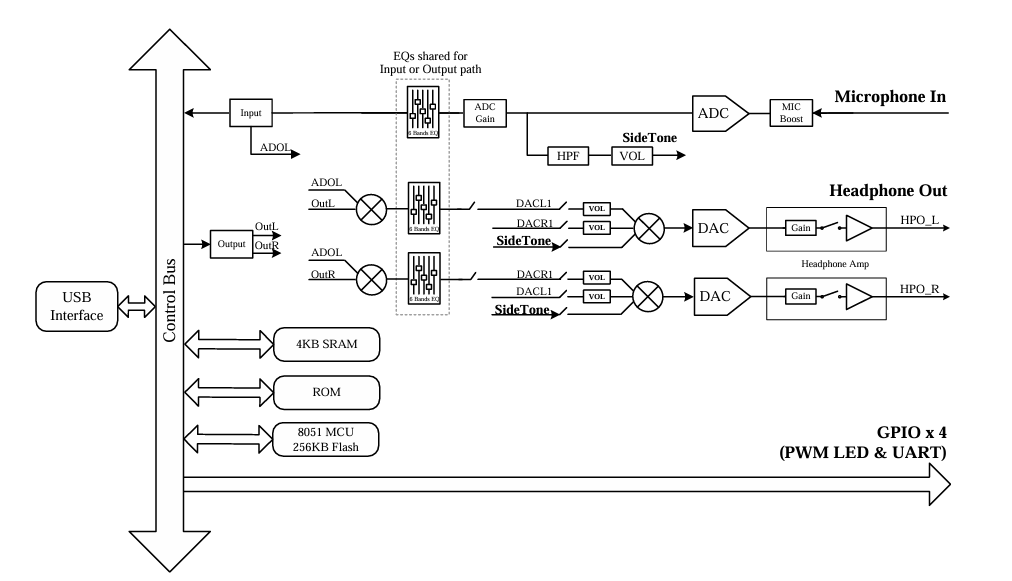 - Side-Tone path: 44.1K~192KHz with 16/24-bits